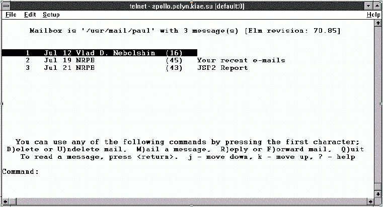 На экране появляется сообщение о версии системы, список полученных сообщений и список команд, которыми может воспользоваться пользователь. Следует обратить внимание на то, что некоторые версии elm способны подстраиваться под размер экрана автоматически.