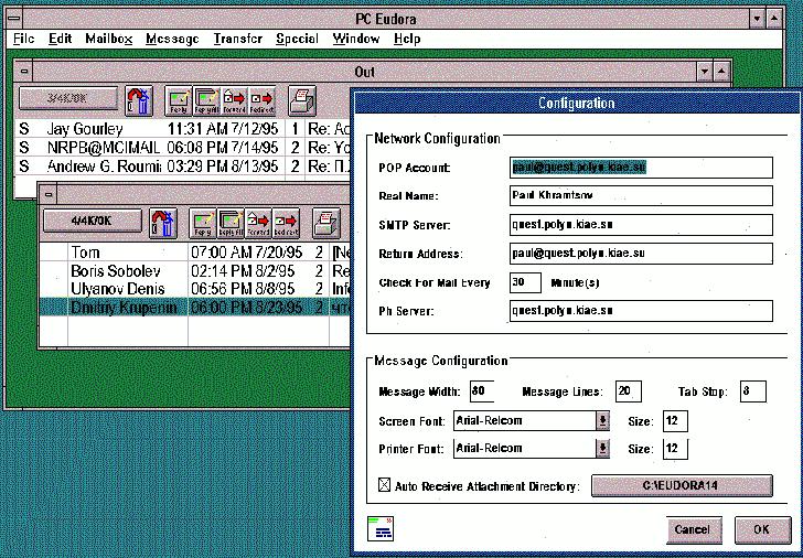 Если пользователь пишет только по-английски, то у него нет проблем с кодировкой и набором текста, но если он пишет по русски и получает такие же сообщения, то сразу же возникают проблемы. Дело в том, что большинство почтовых сетей для обмена данными между серверами используют кодировку KOI8. Эта кодировка отличается как от кодировки для MS-DOS, так и от кодировки MS-Windows. Поэтому, возвращаясь к иллюстрации с настройками интерфейса Eudora, хочется обратить внимание читателя на поля КSend FontЧ и КPrinter FontЧ. В этих полях указан шрифт КArial-RelcomЧ, который разложен по кодировке KOI8, и используется для отображения и печати почтовых сообщений. Для того чтобы правильно набирать сообщения, следует к стандартным раскладкам клавиатуры в драйвере клавиатуры (cyrwin, например) добавить раскладку для KOI8.